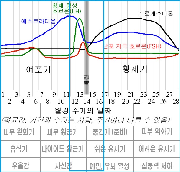 황체형성호르몬이 급증하는 날, 아주 피로하며 생각나는 음식이 많다. 이때에, 건강한 종류의 충분한 지방, 건강한 종류의 충분한 단백질, 건강한 종류의 충분한 탄수화물을 섭취하면, 급증한 다음날 컨디션 회복에 유리하다. 다음날 약간의 체중 증가가 있을 수 있지만, 곧 회복될 것이다. 이날 열량 섭취를 충분히 하는 것이 앞으로의 식욕 관리에 유리하다.